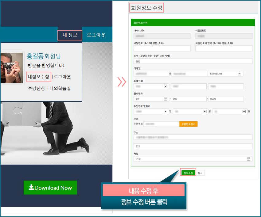 Á¤º¸¸¦ º¯°æ ÈÄ È®ÀιöưÀ» Ŭ¸¯ÇÕ´Ï´Ù.